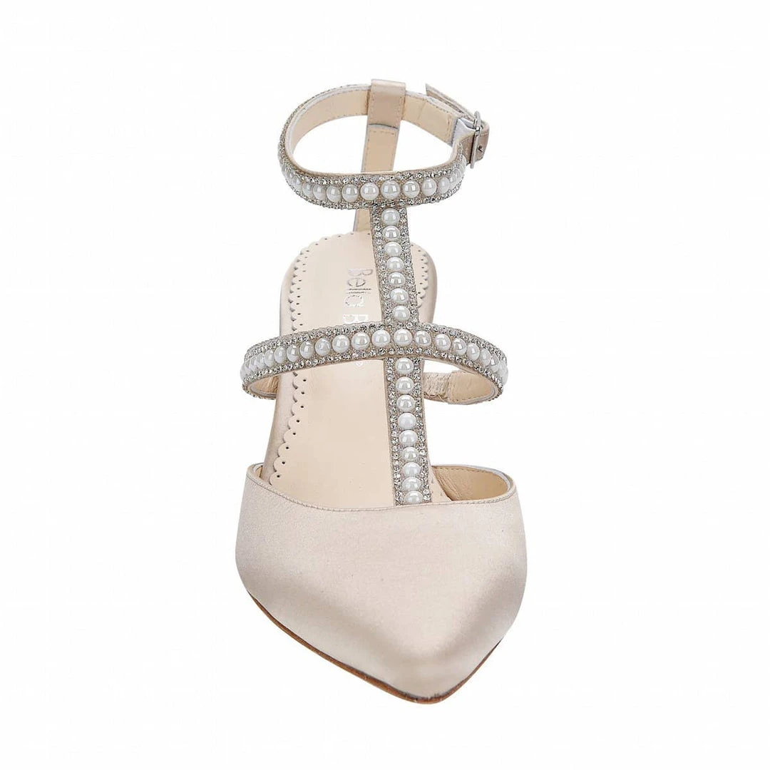 Courtney champagne kitten heels are the perfect combination of comfort and glamor! The sexy pointed toe is cut to reveal toe cleavage, while the T-strap elongates your legs. Classic luminous pearls against glittering silver add just the right amount of twinkle. These evening and champagne wedding shoes low heel pumps offer maximum comfort for all-day wear.