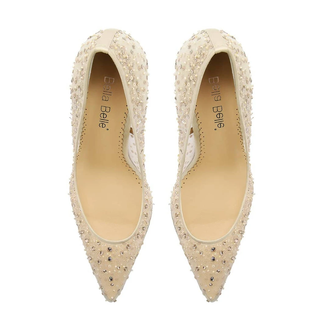 Elsa Nude, sparkly nude heels are from the Bella Belle Euphoria collection. These stunning Cinderella nude embellished heels for weddings and special occasions feature a 4-inch heel and hand-beaded sequin dégradé with embellished crystal Strass for a mesmerizing shimmer effect! Elsa nude sparkly heels are a comfortable and modern take on Cinderella’s glass slipper.