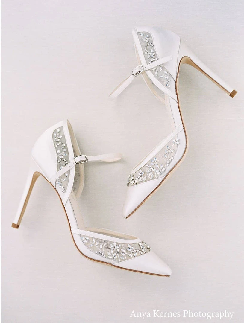 Dainty vines of sparkly crystal sprout along the gentle curves of the Emma pump’s D’Orsay wedding shoes silhouette. Ivory silk caps off the heel and toe for a chic, modern ivory closed toe wedding shoes look. Keep your crystal high heels shoes secure with a buckle strap across the front.