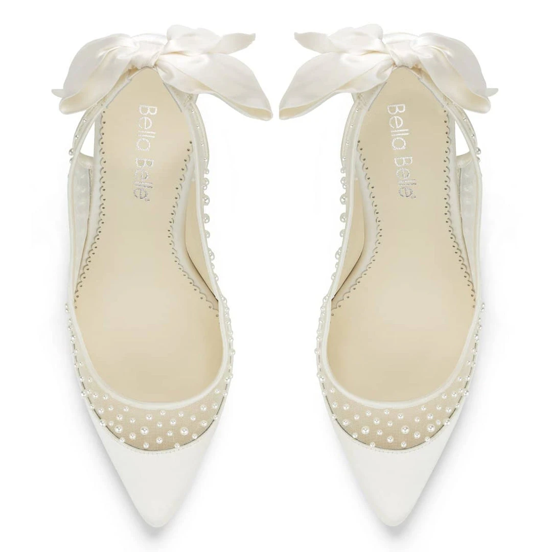 The crisp ivory silk on the bottom of our Gabrielle ivory slingback wedding shoes follows the natural curve of your foot, with a careful scattering of tiny pearls above. A large silk bow at the back of this slingback pumps heel will give your step extra bounce. These elegant pointed toe bridal shoes with pearls are ready for any fancy dress occasion.