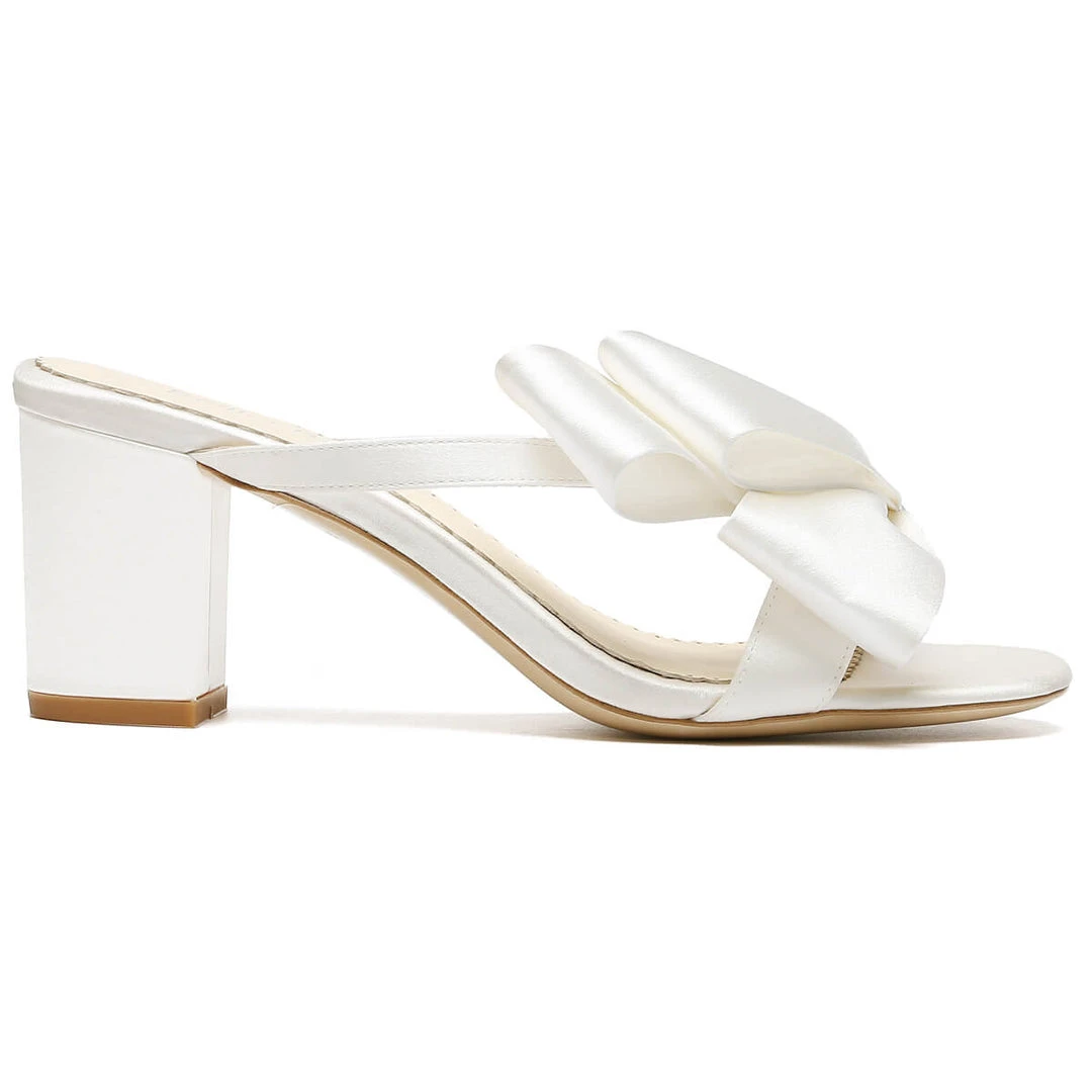 This chic and modern low block heel bridal sandal is jazzed up with asymmetrical bows. Lively cutouts expose lots of skin to make Imani the perfect bridal sandals for your outdoor wedding. This slip on bridal mule sandal is adorned with side-swept sculptural bows that give it a playful vibe. Dress this chunky slip on block heel up or down from stylish casual to formal glam