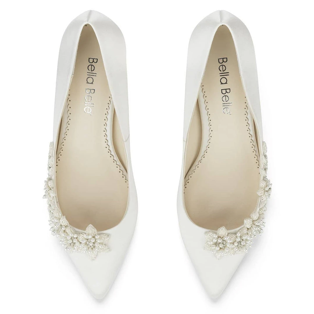 The perfect, chic kitten heel wedding shoes ivory in color, re-imagined and re-defined. Teardrop luminous pearls and ivory beads are embellished in the shape of flowers and vines sweeping up to the side of these white pearl wedding shoes. The 3D ivory blooms and vines provide textural contrast to the classic ivory silk. These satin wedding shoes low heel in design bring comfort to this statement making heel.