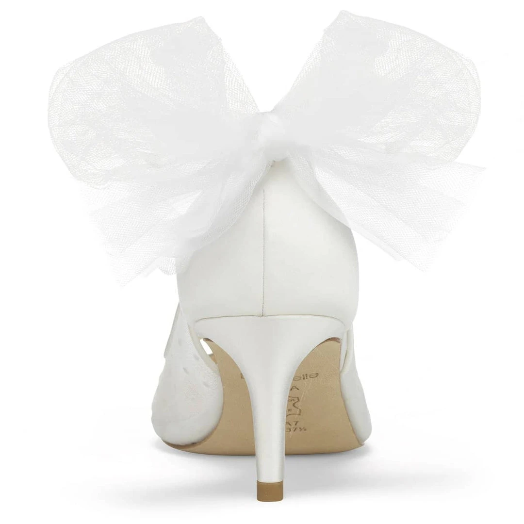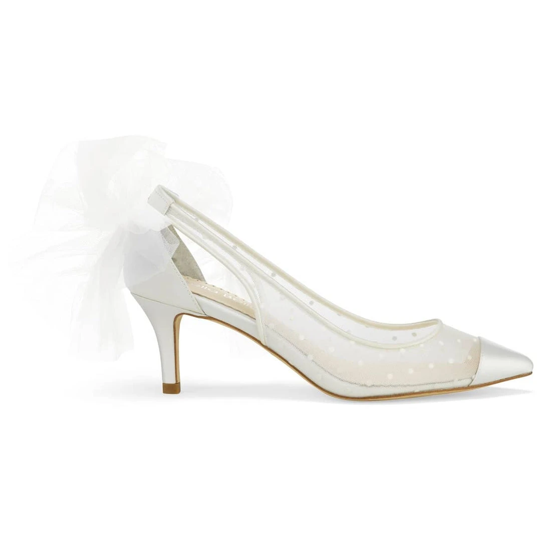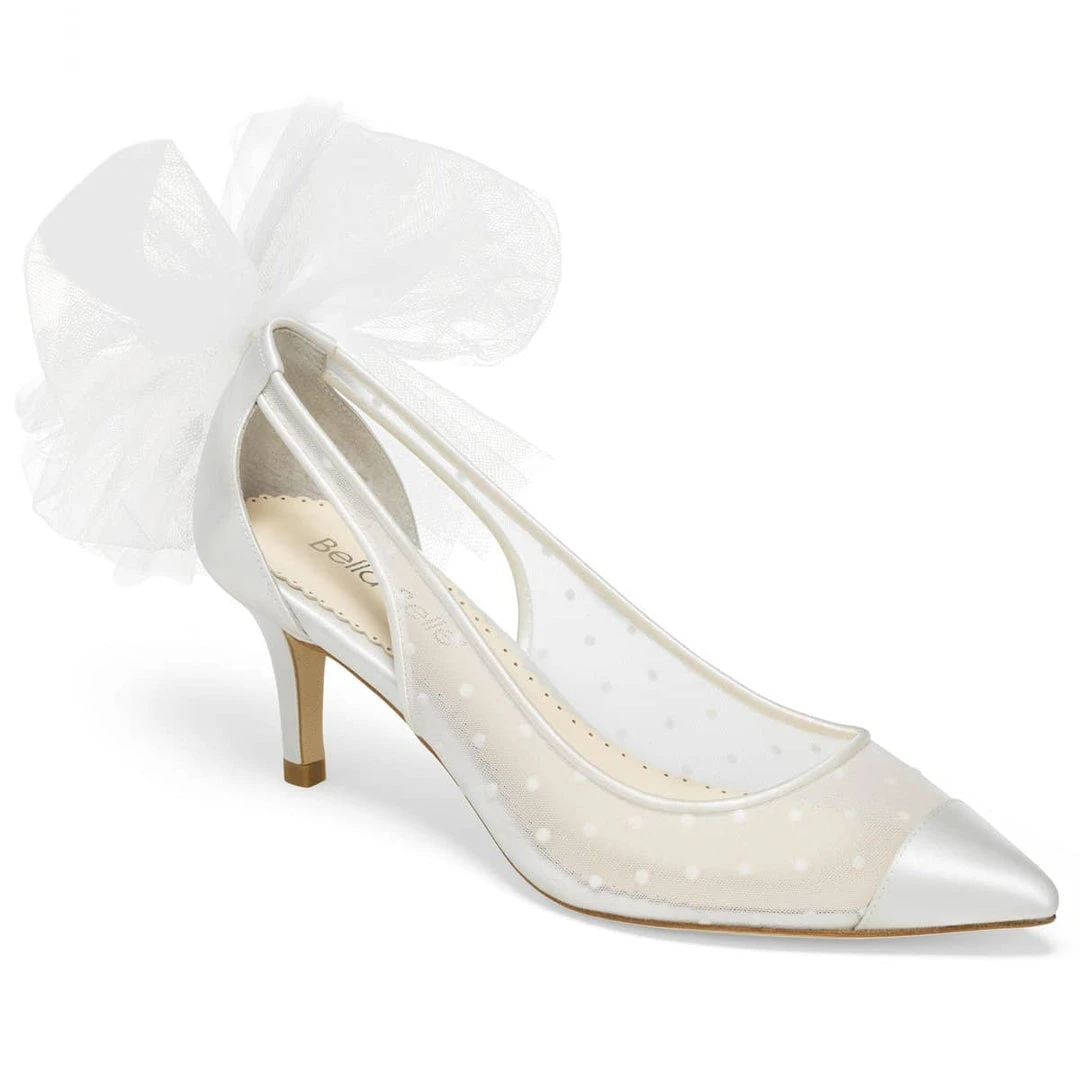 Feminine and sophisticated, our Maggie polka dot heels feature a chic Swiss dot pattern, capped off with sleek and shiny silk at the toe. These slingback pumps low heel shoes include sexy cutouts in the back and an oversized tulle bow to break up the lines from toe to heel. Maggie slingback pumps low heel shoes keep you moving comfortably as limping as heel pain is not in vogue.