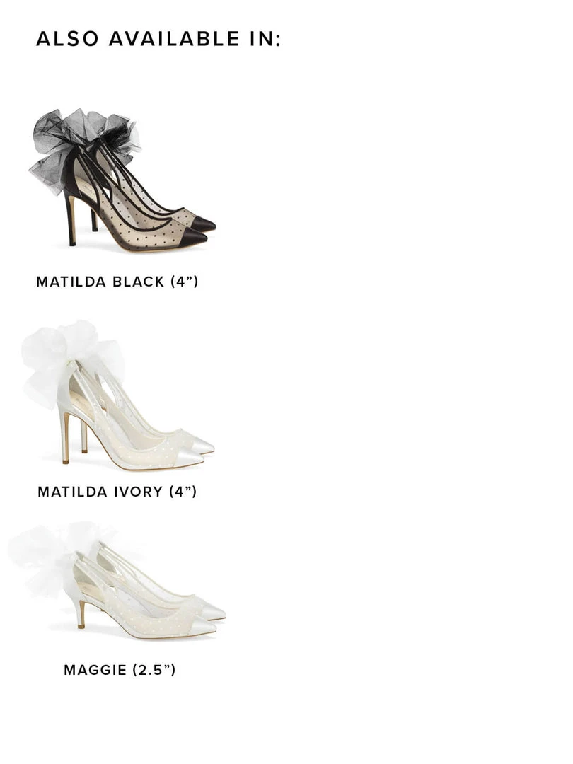 Feminine and sophisticated, our Matilda polka dot high heel shoes feature a chic Swiss dot pattern, capped off with sleek and shiny silk at the toe. Sexy cutouts in the back and an oversized tulle bow break up the lines from toe to heel. Matilda balances soft, sharp, darling, and daring all in one pair of tulle heels.