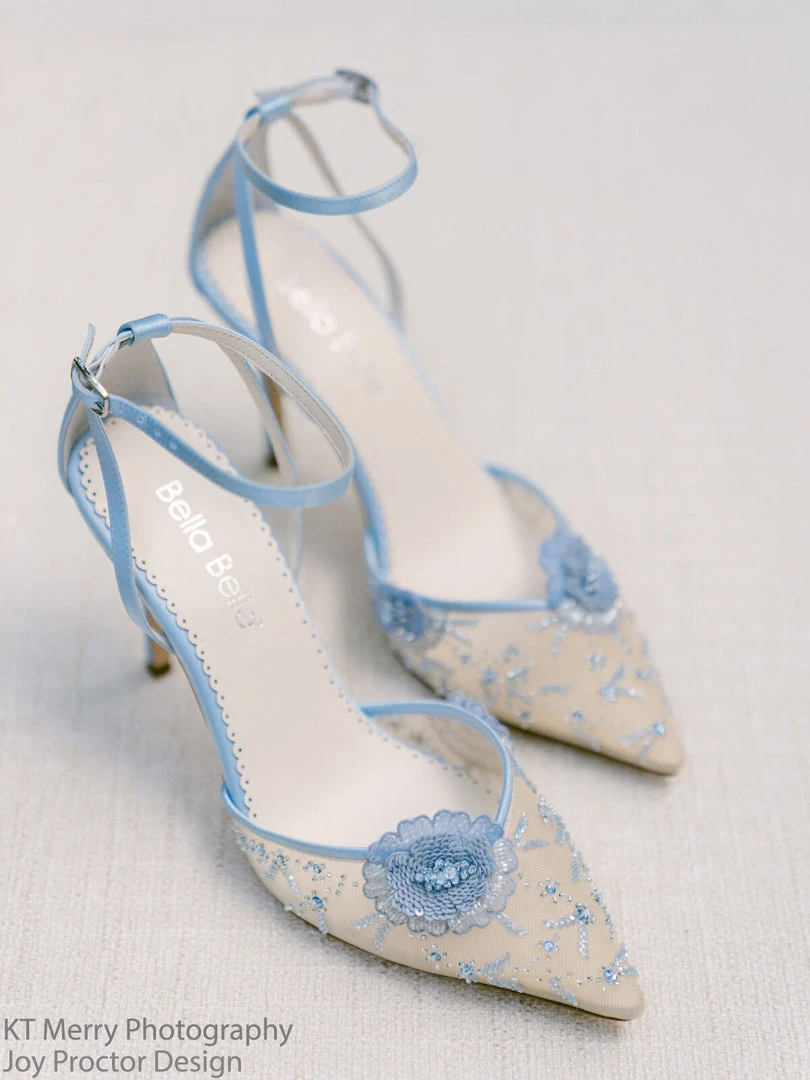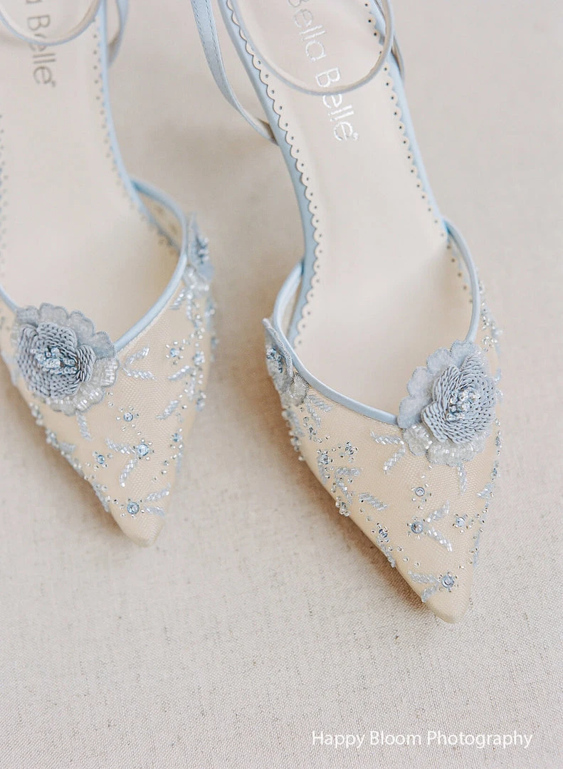 Sequined petals are meticulously stitched together to form two brilliant roses on the toe of Norah, blue ankle strap heels. Shimmering beads and sequins catch the light with every glittering step. These blue heels with ankle strap feature a seductive cutout design at the heel.